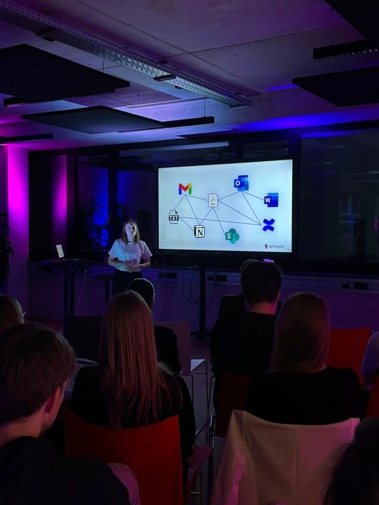 Natürlich dürfen ein paar interessante Insights aus der Welt der KI auf unseren Events nicht fehlen. Nachdem es sich alle mit einem kühlen Getränk neben einigen neuen Bekanntschaften bequem gemacht hatten, bot Sarah mit ihrem Wissen, wie Künstliche Intelligenz im Wissensmanagement genutzt werden kann, einen spannenden Einstieg. Besonders interessant für Firmen, die die Knowledge ihres KI-Assistenten mit firmeninternen Daten erweitern möchten! Sarah betonte, wie das Management von internem Wissen und Daten die Produktivität maßgeblich verbessern und Zeit einsparen kann.
