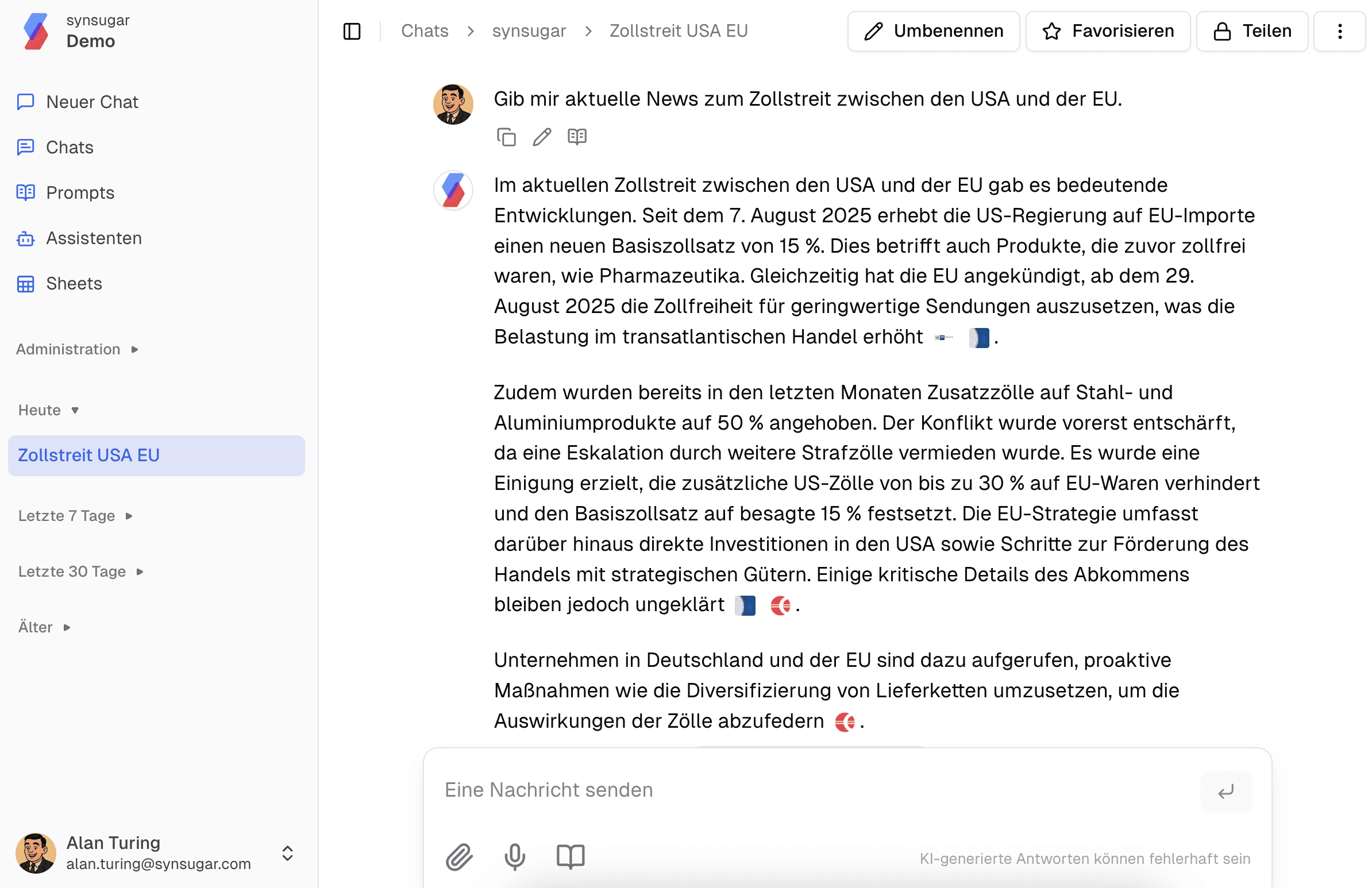 Alle Bereiche der AI Suite wurden umfassend überarbeitet, vereinfacht und modernisiert. Das Layout und die Sidebar wurden dabei von Grund auf erneuert, um die Nutzung noch intuitiver zu gestalten. Durch die neue Breadcrumb-Navigation ist jetzt immer klar, wo man sich in der App befindet. Außerdem wurde die Konfiguration von Assistenten, Prompts, Sheets und Knowledges deutlich vereinfacht.