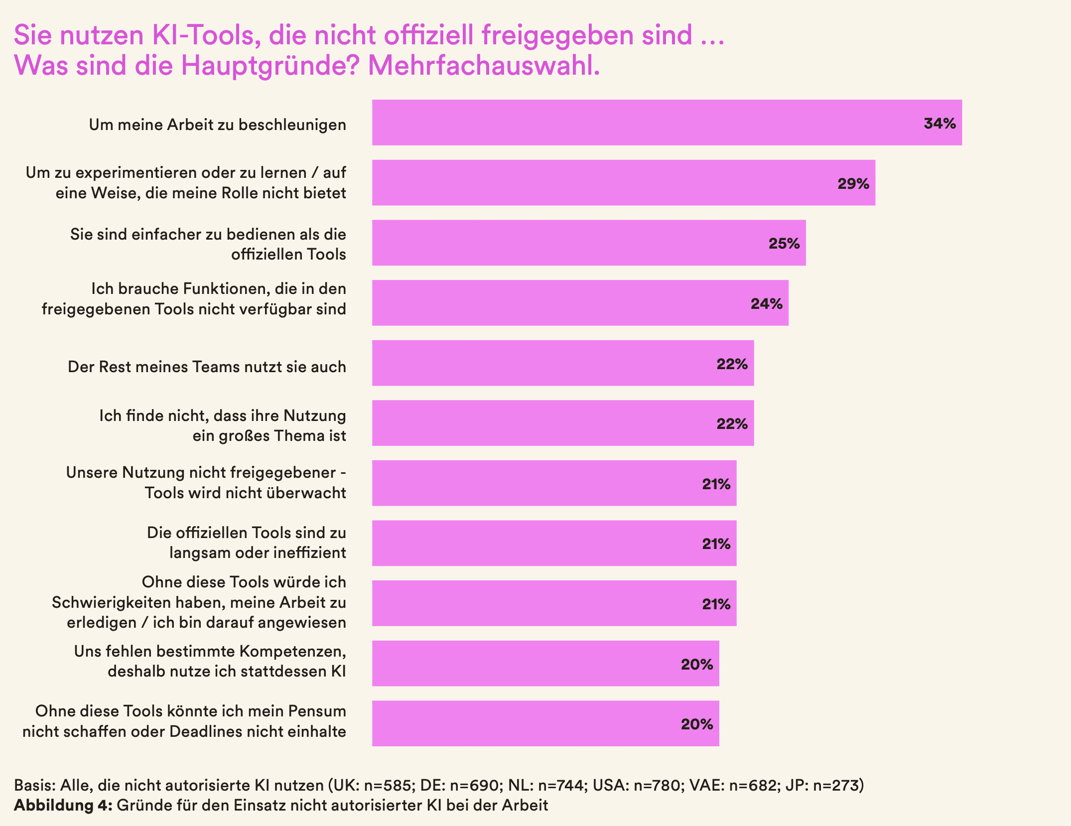 Aus der Erhebung wird deutlich, dass besonders der Produktivitätsdruck und der Wunsch nach mehr Effizienz in den täglichen Prozessen die Nutzung inoffizieller KI-Tools vorantreibt. Über ein Drittel der Befragten Nutzer nutzt KI-Tools, um ihre Arbeit zu beschleunigen. Ungefähr ein Viertel der Befragten spürt die Diskrepanz zwischen tatsächlichen Anforderungen und verfügbaren Lösungen - in ihrer täglichen Arbeit stoßen sie an die Grenzen der autorisierten Tools und benötigen zum Erledigen der Aufgaben andere Funktionen.