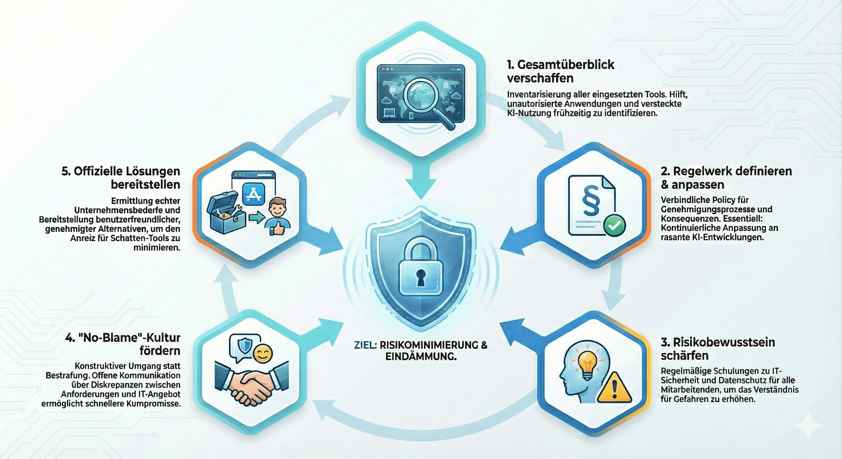 - Bedarf aufnehmen und Alternativen bieten: Indem Bedürfnisse ermittelt und geeignete, benutzerfreundliche Lösungen bereitgestellt werden, kann der Anreiz zur Nutzung inoffizieller Tools minimiert werden.