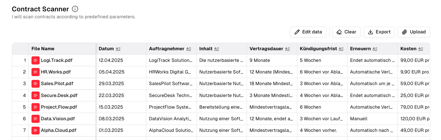 Die KI geht jeden Vertrag einzeln durch und füllt Deine Tabelle Zeile für Zeile aus. Das dauert – je nach Menge – nur wenige Sekunden bis Minuten. Das Ergebnis: Eine vollständig ausgefüllte Tabelle mit allen wichtigen Eckdaten.Abschluss