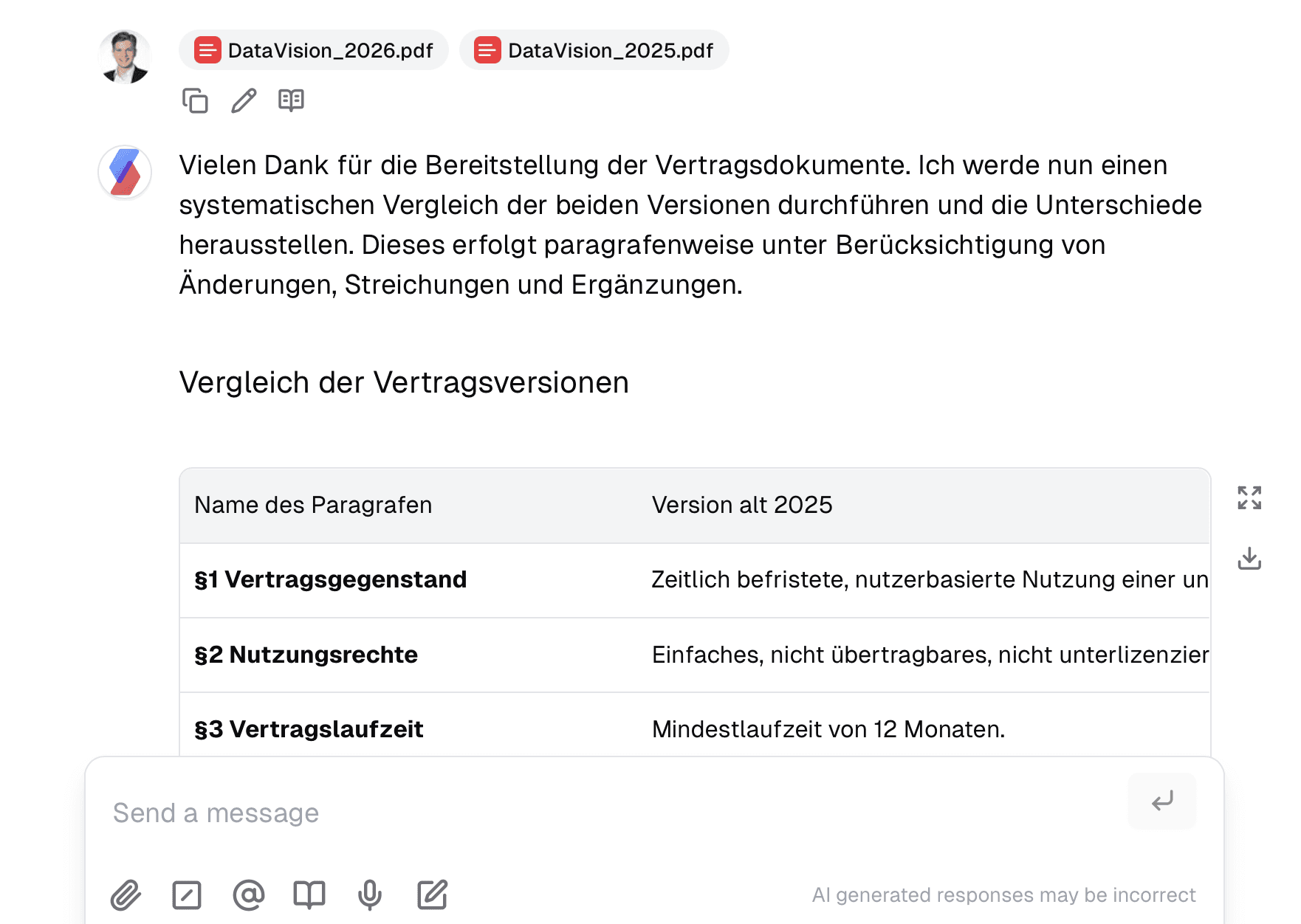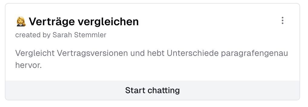 Die Nutzung dieses Assistenten “Verträge vergleichen” ist sehr simpel: Durch die definierten Instruktionen muss nicht jedes Mal erklärt werden, was der Assistent zu tun hat, sondern Du kannst direkt mit dem Vergleich beginnen: Lade dazu einfach zwei Vertragsversionen im Chat hoch und der Assistent startet sofort mit seinen Analysen.