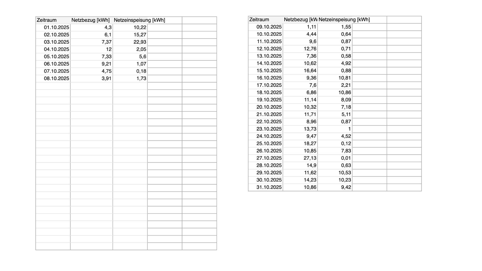 Datenaufbereitung und -zusammenführung, z.B. mehrere Tabellen in eine Tabelle überführen: Mithilfe von KI lassen sich außerdem mehrere Datensätze zusammenführen, die demselben Schema folgen. So können Nutzer Dateien komprimieren, übersichtlich verwalten und Datenchaos reduzieren. Im folgenden Beispiel wurden zwei Datensätze eines Energieunternehmens zusammengeführt, die den Netzbezug und die Netzeinspeisung an jedem Tag eines Monats dokumentieren. Das erste Dokument bricht an einer Stelle ab und die Daten werden im zweiten Dokument fortgeführt - beide folgen aber derselben Struktur.