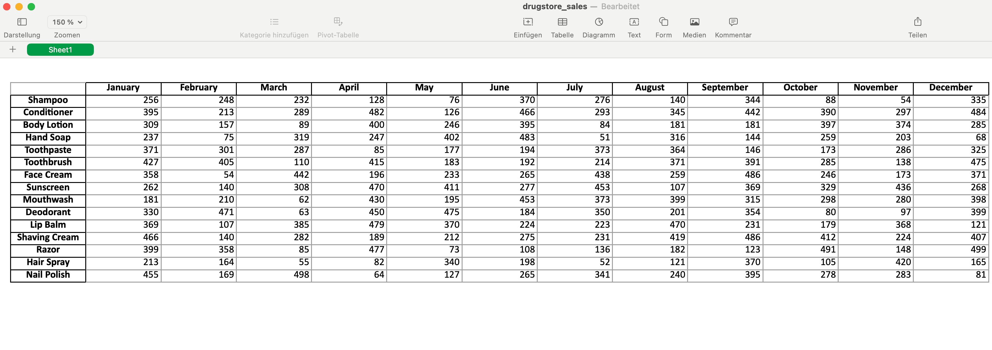 Ursprungsdokument mit den Verkaufszahlen von Drogerieprodukten im vergangenen Jahr.